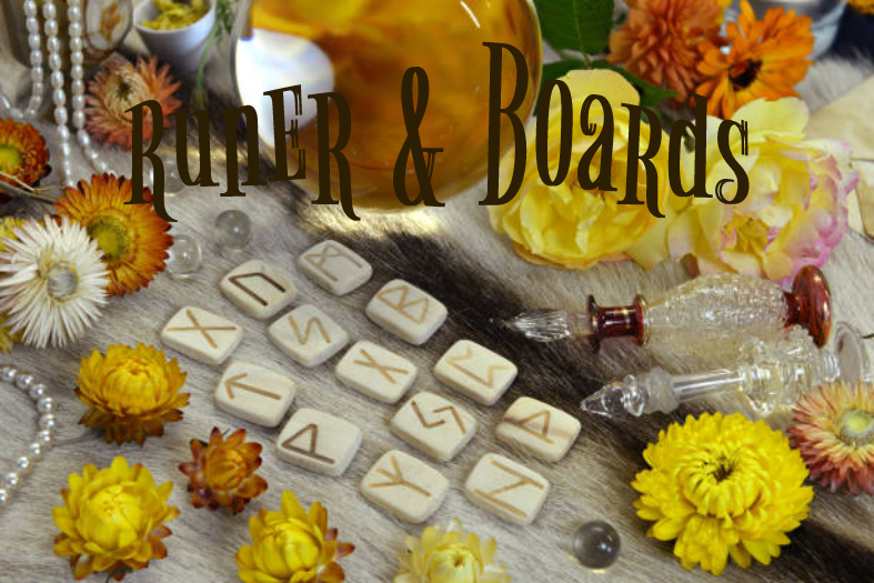 Vi har da også runer og forskellige boards. Spiritboards, pendulboards, ouijaboards og runeboards. Her er tale om dygtige værktøjer, der kan bruges af begyndere såvel som de mere øvede for svar, divination, amuletter og orakel.