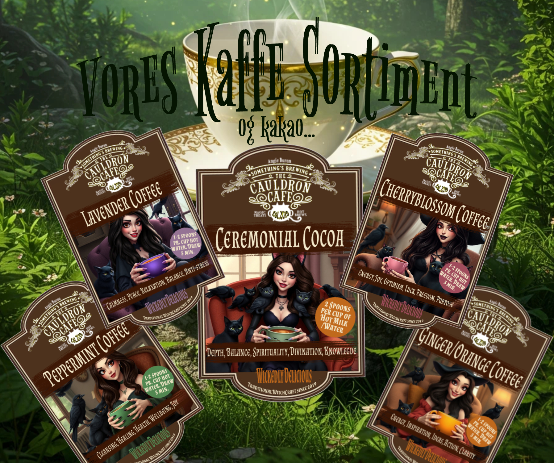 Vores forskellige koffein-holdige kaffe varianter går under kategorien "Urte-kaffe". Det er hele bønner, kværnet med forskellige urter, planter og krydderier, igen går vi op i økologi, bæredygtighed og egen produktion. De egner sig bedst til stempelkande og kan med fordel bruges til is-kaffe. Vi skal også lige huske vores mørke, kraftige ceremoni kakao. Den er blandet med forskellige ingredienser for, at opnå den meditative og afslappende tilstand, der meget ofte bruges under Måne-ceremoni, dog er kakaoen en oplevelse i sig selv! Og når vi nu selv skal sige det, så har vi ramt smagen lige i r....